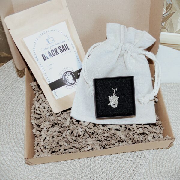 Tomuto dárkovému balení vévodí krásný designový šperk ze šterlingového stříbra, ručně vyrobený v naší jablonecké dílně a zabalený do naší elegantní krabičky Galleon Bay. Krabička je zabalena v jedinečném lněném pytlíčku, který personalizujeme na vaše přání – jménem, iniciály, přezdívkou, datem či slovem podle vašeho výběru. K tomu v krabici najdete ještě stylovou praženou kávu Black Sail.